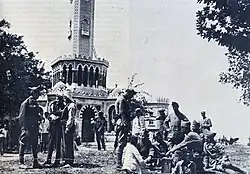 Griechische Soldaten und Zivilisten beim Uhrturm von Izmir im Sommer 1920.