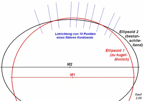 Das Attribut bestanschließend bezieht sich darauf, dass ein System kleinstmöglicher Lotabweichungen mit einer optimalen Anpassung des Ellipsoids an das Geoid in dem von Messungen überdeckten Bereich gleichbedeutend ist (siehe Abbildung). Dehnt man das Projektgebiet über einen ganzen Kontinent oder noch weiter aus, dann nähern sich die Ergebnisse umso mehr den Achsen des mittleren Erdellipsoids an, je größer das Berechnungsgebiet ist.