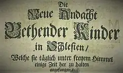 - ↑ Pia Schmid: Auffallende Kinder im beginnenden 18. Jahrhundert. Die Herrnhuter Kindererweckung 1727 und das schlesische Kinderbeten 1707/08. In: Wolfgang Behringer, Claudia Opitz-Belakhal (Hrsg.): Hexenkinder – Kinderbanden – Straßenkinder. S. 362.
