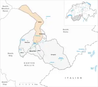 - ↑ Iwar Werlen (Hrsg.): Oberwalliser Orts- und Flurnamenbuch. Band 1: Einleitung, Gemeindenamen, Flurnamen A–C. Narr Francke Attempto, Tübingen 2024, S. 4, ferner Lexikon der schweizerischen Gemeindenamen. Hrsg. vom Centre de Dialectologie an der Universität Neuenburg unter der Leitung von Andres Kristol. Frauenfeld/Lausanne 2005, S. 146 f.