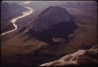 ![]() Blick in Richtung Südsüdost auf den Sukakpak Mountain; links der Bettles River heranströmend, rechts der Middle Fork Koyukuk River wegströmend | ||
