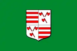 Beschreibung: Im silbernen gevierten Wappen im ersten und vierten Feld drei rote Balken und in den anderen Feldern je drei rote Bartenspitzen auf roten Stielen (2,1) gestellt. Die unteren zeigen nach rechts.