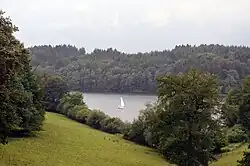 Die Bevertalsperre lässt sich auf dem 15 km langen Bever-Rundweg in drei bis vier Stunden umwandern.