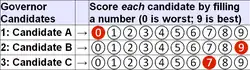 Jeder Wähler bewertet alle Kandidaten unabhängig voneinander und wählt dafür zur Bewertung aus einer Skala von möglichen Werten, beispielsweise die natürlichen Zahlen von 0 bis 9. Dabei können Zahlen mehrfach vergeben werden und natürlich muss nicht jede Zahl Verwendung finden. Es ist auch erlaubt, einzelnen Kandidaten gar keine Note zu geben.