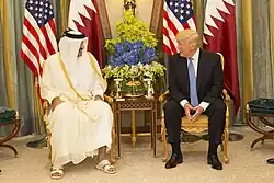 Katar vermittelte ein Abkommen zwischen den Vereinigten Staaten und dem Iran, das im September 2023 zur Freilassung von fünf Gefangenen in beiden Ländern und der Freigabe von 6 Milliarden US-Dollar an iranischen Geldern führte, die aufgrund von Sanktionen der USA eingefroren worden waren.[12] Am 7. Oktober 2023 eskalierte der Konflikt zwischen Israel und der Hamas nach einem massiven Terrorangriff militanter palästinensischer Organisationen in israelisches Gebiet. Inmitten des Konflikts spielte Katar eine entscheidende Rolle bei der Freilassung von zwei amerikanischen Geiseln der Hamas. Katar unterhält hervorragende Kontakte zur Hamas und das Führungspersonal und der Sitz der Organisation befindet sich in Katar, was dem Land eine große Rolle in den Verhandlungen um die Beilegung des Konflikts zwischen Israel und den Hamas verleiht. Die Vermittlung durch Katar bei der Freilassung der Geisel wurde von US-Präsident Joe Biden gelobt, der sich bedankte.[13] Im Mai 2025 besuchte Donald Trump Katar und nahm eine 400 Millionen teure Boeing 747 als Geschenk an, welche die neue Air Force One werden soll.[14] Bei seinem Besuch wurden verschiedene Geschäfte verkündet, darunter eine Bestellung von 200 Boeing-Flugzeugen durch Qatar Airways.[15]
