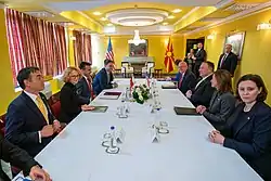 Am 4. November 2004 erkannten die USA Nordmazedonien entgegen dem Widerstand Griechenlands offiziell unter seinem verfassungsmäßigen Namen „Republik Mazedonien“ an.[2] 2005 wurde das Land EU-Beitrittskandidat; den angestrebten NATO-Beitritt konnte Nordmazedonien zunächst nicht erreichen, da Griechenland im April 2008 sein Veto einlegte. Als Reaktion bekräftigten die USA ihre Unterstützung und schlossen am 7. Mai 2008 die Erklärung über die strategische Partnerschaft mit Nordmazedonien ab. Darin sagten die USA dem Land weitere Zusammenarbeit in den Bereichen Sicherheit, Militär, Handel und Kultur zu.[4] Nach der Lösung des Namensstreits durch das Prespa-Abkommen von 2018 änderte das Land seinen Namen in „Republik Nordmazedonien“. Im März 2020 trat Nordmazedonien der NATO bei und wurde damit zum 30. Mitgliedstaat des Bündnisses.