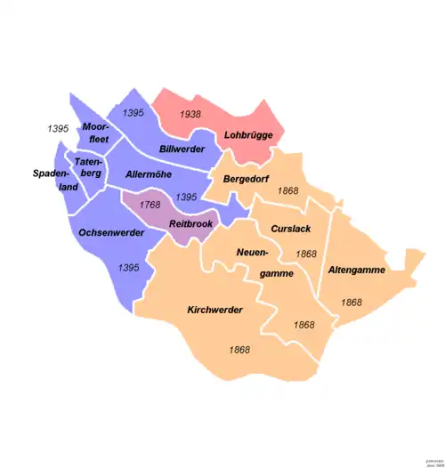Der Bezirk war bis zur Auflösung der Ortsamtsbereiche am 1. März 2008 in das Kerngebiet (mit Bergedorf und Lohbrügge) und in den Ortsamtsbereich Vier- und Marschlande (mit Allermöhe, Altengamme, Billwerder, Curslack, Kirchwerder, Moorfleet, Neuengamme, Ochsenwerder, Reitbrook, Spadenland und Tatenberg) unterteilt.[9] Seit dem 1. Januar 2011 gehört der neue Stadtteil Neuallermöhe zum Bezirk.