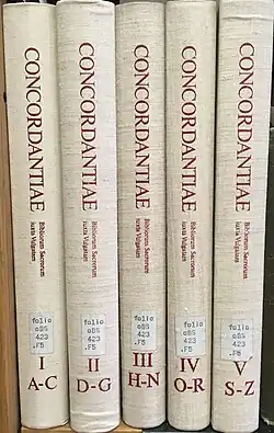 Diese mittelalterlichen und frühneuzeitlichen Konkordanzen der Vulgata bildeten den Ausgangspunkt für die zahlreichen gedruckten und mehrfach angepassten Konkordanzen bis in die jüngere Zeit, die erst durch die elektronisch basierte, 1977 in Stuttgart bei Frommann-Holzboog in fünf Bänden gedruckte Konkordanz des Benediktiners Bonifatius Fischer abgelöst wurden. Fischer erstellte seine Ausgabe, indem er den kritischen Text der Stuttgarter Ausgabe der Vulgata (2. Aufl. 1975) einschließlich der Einträge im kritischen Apparat auf 8-Kanal-Lochstreifen eingab und die Wortformen mit Hilfe des von Roberto Busa SJ für seinen Index Thomisticus erstellten (und in Tübingen für diesen Zweck erweiterten) „Lexicon Electronicum Latinum“ auf die lexikalischen Grundformen reduzierte. Zum Vermeiden von Abschreibfehlern wurde der Text zweimal erfasst und automatisch verglichen.[2] Die Computerarbeiten wurden im Zentrum für Datenverarbeitung der Universität Tübingen mit Hilfe von Programmen durchgeführt, aus denen das Tübinger System von Textverarbeitungsprogrammen TUSTEP hervorgegangen ist[3].
