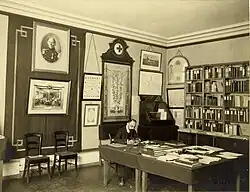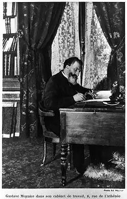 Im Jahr 1871 bezog das IKRK einen offiziellen Sitz in der Rue de l’Athénée Nr. 3 und damit in unmittelbarer Nähe von Moyniers prächtiger Privatresidenz.[1][4][5] Obwohl es sich um eine der repräsentativsten Adressen der Stadt handelte, waren die Räumlichkeiten mit gerade einmal drei Zimmern vergleichsweise bescheiden.[6] Eines von ihnen diente sowohl als Bibliothek wie auch als Museum.[7]