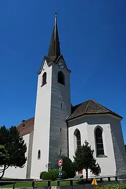 Die reformierte Kirche wurde 1960 durch den Architekten Edwin Rausser nach dem Modulor von Le Corbusier erbaut. Eine künstlerische Besonderheit ist die Eingangstüre mit den Tieren der Arche Noah, die in modern stilisierten Formen in das Holz geschnitzt sind.