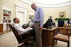 Biden wurde am 20. Januar 2009 im Rahmen einer Zeremonie vor dem Kapitol in Washington als Vizepräsident vereidigt, wenige Minuten bevor Barack Obama den Eid für das Präsidentenamt leistete. Er löste damit George W. Bushs Vizepräsidenten Dick Cheney ab. Cheney hatte das Vizepräsidentenamt energisch ausgeübt; Biden dagegen sagte, er wolle im Hintergrund ein wichtiger Berater von Präsident Obama sein.[31] Als Vizepräsident unterstützte er maßgeblich Obamas Kurs in der Innen- und Außenpolitik. Mehrmals reiste Biden auch als dessen Repräsentant für Gespräche mit anderen Regierungen oder die Wahrnehmung zeremonieller Aufgaben, die häufig Vizepräsidenten zufallen, ins Ausland. Biden galt als klarer Unterstützer der 2010 verabschiedeten Gesundheitsreform in den Vereinigten Staaten, die US-Präsident Obama vehement vorantrieb. Durch die Reform erhielten mehrere Millionen Amerikaner Zugang zur gesetzlichen Krankenversicherung.