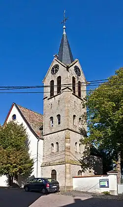 - Die evangelische Kirche ist ein spätbarocker Saalbau, bezeichnet 1770, mit einem Sandsteinquaderturm von 1901. Die Ausstattung stammt aus der Erbauungszeit. Im Chor befindet sich der Wappengrabstein von Margarete von Biebelnheim, 1589. Der Orgelprospekt stammt von 1780.[10]