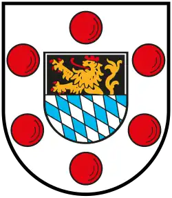Blasonierung: „In Silber ein Schild, dieser geteilt; oben in Schwarz ein wachsender goldener Löwe, rotgezungt und -gekrönt, unten Silber und Blau gerautet; der Schild begleitet von sechs roten Kugeln (3:2:1).“ |