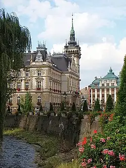 - Im gleichen Gebäude wie das Teatr Polski heute wurde 1890 auf Initiative kulturbeflissener Bielitzer Bürger das Deutsche Theater gegründet. Der Entwurf stammte vom Wiener Architekten Emil Ritter von Förster. Bekannte Wiener Künstler wie der Hoftheatermaler Jan Kautsky (der Vater des marxistischen Politikers Karl Kautsky) arbeiteten an der Gestaltung des Theaterinneren mit. 1905 wurde das Innere durch die Architekten-Compagnie Fellner & Helmer, die auch das Deutsche Volkstheater in Wien errichtet hatte, umgebaut. Die Fassade zeigt Statuen der von Apollo und der Musen Melpomene und Thalia, die Kurtine einen „Tanz der Nymphen“. Das Bielitzer Theater war ein Symbol der engen kulturellen Beziehungen zwischen Bielitz und Wien und galt Jahre hindurch sogar als bestes österreichisches Sprechtheater außerhalb Wiens. Vor dem Ersten Weltkrieg traten hier Stars wie Alexander Girardi, Alexander Moissi und Adele Sandrock auf, 1918 debütiert hier die jüdische Schauspielerin Ida Ehre, die Begründerin der Hamburger Kammerspiele. 1936–1938 war der Bühnenbildner und Regisseur Gustav Manker am Haus engagiert.[9] Zuvor bestand bereits war ein deutschsprachiges Theater in Bielitz, das am 16. März 1857 im damaligen „Zunfthaus“ eröffnet wurde.[10] Das Bielitzer Theater musste sich starker Konkurrenz stellen, da Wien – mit 350 km näher gelegen als Warschau – infolge der vorzüglichen Eisenbahnverbindungen für die Bielitzer leicht erreichbar war. Jeden Freitag fuhr in nur 4 ½ Stunden ein Direktzug nach Wien und brachte das kulturbeflissene Bielitzer Bürgertum ins Burgtheater und in die Staatsoper, wobei ein halber Waggon nur den Abendgarderoben der Damen vorbehalten war.[11]