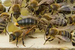 Soeben begattete Bienenkönigin mit abgebrochenem Geschlechtsteil des letzten Drohns