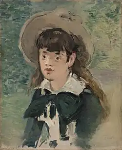 Das als Brustbild ausgeführte Porträt zeigt eine junge Frau von vorn. Sie hat weit geöffnete dunkle Augen, die direkt zum Bildbetrachter schauen. Darüber erscheinen bogenförmige dichte schwarze Augenbrauen. Ihr kleiner geschlossener Mund ist durch blassrosa Lippen gekennzeichnet. Das Inkarnat erscheint in Teilen nahezu weiß, auf ihrer rechten Seite deutet eine rosafarbene Partie eine Schattenwirkung an. Auf dem Kopf trägt die Dargestellte einen „runden schwarzen Hut mit hochgeschlagener Krempe“[5], der weit nach hinten gezogen den Stirnbereich frei lässt. Unter dem Hut schaut ihr dunkelblondes Haar hervor, das die Stirn weitestgehend bedeckt und als Strähne bis über das rechte Ohr fällt.[6] Bekleidet ist die junge Frau mit einem grauen Kleid, das am Hals mit einer breiten weißen Rüsche abgeschlossen ist.[5] Vor der Brust hält sie einen geöffneten rostbraunen Fächer. Der Hintergrund ist als hellgraue Fläche gehalten, um den Kopf herum erscheint der Farbauftrag kräftiger. Insgesamt ist das Bild skizzenhaft umgesetzt. So sind beispielsweise beim Kleid einzelne Farbstriche erkennbar und nur die obere Hälfte des Fächers wurde ausgeführt. Unterhalb des Fächerblattes hat Manet das Bild mittig mit „M“ signiert, aber nicht datiert.[7]