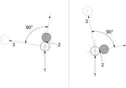 Wenn die angestoßene Kugel nicht mittig getroffen wird, teilt sich die Bewegungsenergie zwischen den Kugeln auf. Sie laufen dann in unterschiedliche Richtungen, und zwar in einem Winkel von 90°. Die weiße Kugel ändert jedoch kurz danach oft ihre Laufrichtung aufgrund ihrer Rotation. Je schneller sie rotiert und je langsamer sie läuft, desto deutlicher ist die Richtungsänderung.[21]