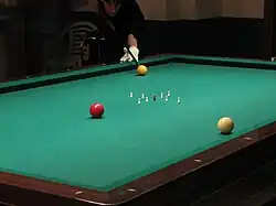 Gespielt wird auf einem 12-Fuß-Tisch mit 16 Kugeln, die mit 68 Millimeter Durchmesser noch größer sind als Karambolage-Kugeln. In den nur 73 Millimeter breiten Einlauf der Ecktaschen ist eine Kugel somit nicht zu versenken, wenn zu einer der beiden Seiten der Tasche der Abstand mehr als 5 Millimeter beträgt.