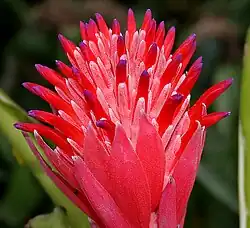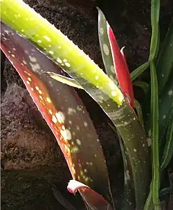 Die derben Laubblätter sind immer am Rande bewehrt (wie bei allen Gattungen der Bromelioideae), mit einer Stachelspitze. Bei einigen Arten und Sorten sind die Blätter schön gefärbt. Saugschuppen sind bei vielen Arten überall auf den Blättern, oft auch auf der Infloreszenz.
