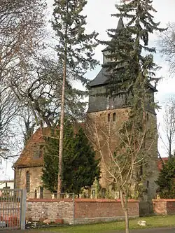 - Die evangelische Kirche St. Petri ist im Kern eine romanische Chorturmkirche. Sie erfuhr im 15. Jahrhundert, 1656 und im 18. Jahrhundert Veränderungen. Die Baumaßnahme von 1656 befahl Ludwig Günther II. wegen des baufälligen Zustands. Hierbei ließ dieser in seinem Landesteil eine Kollekte ausschreiben und bat seinen Bruder Anton Günther I., dies ebenfalls in seinem Landesteil zu tun. Innenrenovierungen geschahen im 18. Jahrhundert und 1936. Die zweiachsige Saalkirche hat einen strebepfeilerartigen Übergang zum Turm. An der Südseite befinden sich wie an der südlichen Turmseite spätgotische Vorhangbogenfenster. Die ursprünglichen Schallöffnungen fungieren als rund- und spitzbogige Zwillingsfenster. Das Glockengeschoss in Fachwerk ist mit einem Zeltdach laternenbekrönt. Im Inneren findet sich eine Holztonne und eine zweigeschossige dreiseitige Empore. Während die Kanzel von 1774 ist, sind die Glocken von 1653 und 1799. Diese zersprangen insgesamt dreimal und wurden 1799, 1827 und 1844 umgegossen.[2][3]