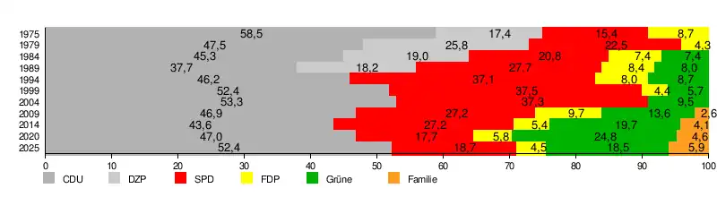In der Liste[4][5][6][7][8] werden nur Parteien und Wählergemeinschaften aufgeführt, die mindestens 1,95 Prozent der Stimmen bei der jeweiligen Wahl erhalten haben.