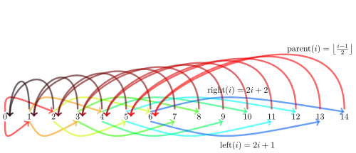 Häufig wird ein Binärer Heap nicht explizit mit Zeigern konstruiert, sondern durch ein Array abgebildet. Will man einen Binären Heap in einem Array speichern, so wird die Wurzel des Baums an der ersten Position im Array gespeichert. Bei einer Array-Indizierung beginnend mit werden die beiden Nachfolger des Knotens an der -ten Position an der -ten und -ten Position gespeichert, entsprechend der Kekule-Nummerierung. Analog dazu sind die Nachfolger des Knotens mit Index an der -ten und -ten Position gespeichert, wenn die Array-Indizierung mit 0 beginnt.