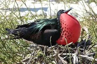 Brütender Bindenfregattvogel (Fregata minor), Männchen mit aufgeblasenem Kehlsack