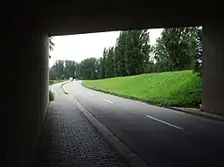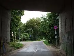 Straße Binsfeld, Einfahrt von Süden in die 30-km- und Parkverbotszone, das Gebüsch links verbirgt den großen südlichen Parkplatz -