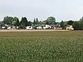 Straße Binsfeld, Einfahrt zur Wohnbebauung von Norden, links Parkplätze der Dauercampinganlage, rechts das erste Haus zwischen Straße und Feldflur