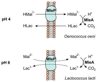Die bei der Decarboxylierung freigesetzte Energie wird in Form eines chemiosmotischen Mechanismus konserviert (vgl. Abbildung).[4] Bei O. oeni, der bei einem pH-Wert von etwa 4 wächst, wird einfach protoniertes Malat (HMal1−) durch einen membranständigen Carrier (MleP) in die Zelle gebracht.[1] Dieses wird zu Lactat decarboxyliert, welches bei pH 4 protoniert (HLac) vorliegt. Der Ausstrom aus der Zelle bei HLac erfolgt ohne Carrier. Lactococcus lactis wächst unter höheren pH-Werten und Malat (Mal2−) wird mit Lactat (Lac1−) durch einen Antiporter (MleP) ausgetauscht.