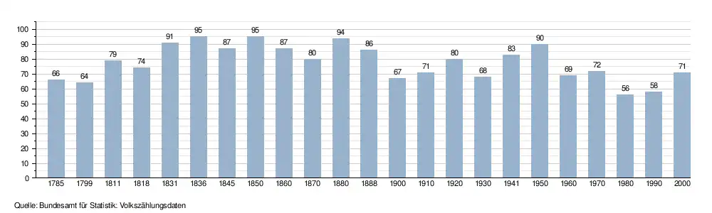 - ↑ Daten der Eidgenössischen Volkszählungen ab 1850 nach Gemeinden. (XLSX; 10 MB) Bundesamt für Statistik, Neuchâtel, 12. Juli 2024, abgerufen am 18. September 2025 (Öffnung in Excel nur über "Anhang/Excel-Datensatz" möglich).