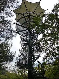 Im Juni 2003 wurde ein Baumwipfelpfad in Betrieb genommen, der sich mit einer Länge von 270 m und einer Höhe von 12 bis 18 m über Grund durch die Baumkronen des Pfälzerwalds zog. Der Normalweg ist als teilweise behindertengerechter Holzsteg angelegt und führt auf etwa halber Strecke am „Adlerhorst“ vorbei, einem 35 m[2] hohen Aussichtsturm. Dieser bietet auf seiner etwa 25 m hoch gelegenen Aussichtsplattform mit dort montierten Ferngläsern einen guten Blick über das Biosphärenreservat und in das Tal des Saarbachs. Alternativ ist der Turm auch über drei „Wackelbrücken“ erreichbar, die Hänge-, Teller- und Dschungelbrücke heißen.[2] Der weitere Holzsteg, an dem einige Erlebnisstationen angebracht ist, hat als Ziel einen zweiten, etwa 20 m hohen Aussichtsturm, von dessen oberer Plattform eine 40 m[2] lange „Riesen-Wendelrutsche“ zurück zum Waldboden führt.
