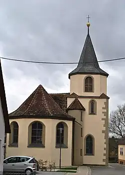 - Die katholische Filialkirche ist der heiligen Maria geweiht. Ursprünglich entstand das Gotteshaus wegen eines wundertätigen Vesperbildes, das sich heute in der St.-Vitus-Kirche Iphofen befindet. Eine Wallfahrt zog schnell Pilger nach Birklingen, die Errichtung des Augustinerchorherrenstiftes war die Folge. In den Jahren 1458 bis 1463 entstanden Chor und Turm, danach ging man an die Erbauung des Langhauses, welches 1506 fertiggestellt war. Nachdem das Gotteshaus im Deutschen Bauernkrieg zerstört worden war, forcierte Bischof Julius Echter den Wiederaufbau als kleinere Kapelle. Wiederum wurde die Kirche 1789 bis 1794[32] nach den Plänen des Johann Michael Fischer umgebaut. Der noch bestehende Hochaltar entstand im Jahr 1794. Ältestes Teil der Ausstattung ist eine spätgotische Madonnenfigur.