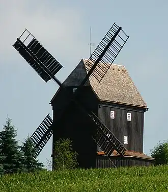 Der Bock auf dem das Mühlenhaus gelagert ist, wurde umhaust, eine Besonderheit der Oberlausitzer Bockwindmühlen. Mit dem Sterz auf der Rückseite, der sogenannten Mondseite, kann eine einzelne Person die Mühle auf ihrem Bock in Windrichtung drehen.