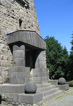 Das für die Bauarbeiten benötigte Wasser kam aus einem eigens für den Bau gebohrten Brunnen. Als Baumaterial diente Grauwacke, die nordwestlich des Turmes unterhalb des Steinbruchs Gut Magney, heute Steinbruch Griesenbrauck, gebrochen wurde. Für die Außenwände der Feuerschale und das Portal wurde Basaltlava verwendet. Einige Baumaterialien wurden vom Ostbahnhof angefahren und die letzten hundert Meter über einen elektrischen Aufzug zur Baustelle transportiert. Wegen des Krieges konnten die Mauerschrägen und Brüstungen nicht wie geplant mit Kupferplatten abgedeckt werden. Stattdessen erhielten sie eine vorläufige Abdeckung aus Zink. Die Gesamtkosten für die Errichtung der Gedenkstätte beliefen sich auf 28.000 Mark.
