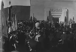 Vor dem Turmeingang liegt ein 5 m breiter und etwa 30 m langer Vorplatz, von dem aus eine 7,65 m breite Freitreppe mit acht Stufen zum Turm führt. Links und rechts der Freitreppe wird der Vorplatz durch eine in Vorsatzmaterial hergestellte Brüstung zwischen zehn Postamenten begrenzt, die von zehn 1 m im Durchmesser großen Betonkugeln bekrönt sind.[2]