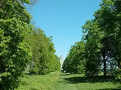 Als direkte Sichtachse vor dem Turm dienen 100 Krim-Linden (Tilia × euchlora K.Koch). Die markante, 1914/15 gepflanzte Linden-Allee steht wegen ihrer historischen Bedeutung und ihrer besonderen landschaftstypischen Schönheit seit 1973 als Naturdenkmal (ND 166) unter besonderem Schutz der Leipziger Naturschutzbehörde. Darüber hinaus haben die Linden besondere kulturhistorische Bedeutung für die Umgebung, kommt doch der Name Leipzig aus dem Altsorbischen („lipa“: die Linde, „lipz“: Lindenort).