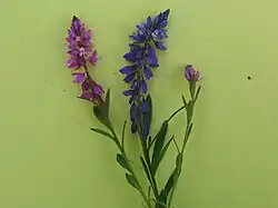 Die zwittrigen Blüten sind zygomorph mit doppelter Blütenhülle. Die Blütenhüllblätter sind in der Regel kräftig blau, bis violett oder rosafarben, selten weiß.[1][2] Die äußeren Kelchblätter sind über 3 Millimeter lang; die Flügel sind selten 4,5 bis, meist 5 bis 8,5 Millimeter lang, und selten 1,8 bis, meist 2 bis 5,5 Millimeter breit. Die Nerven der Flügel sind wenig verzweigt und sind am oberen Ende nicht mit dem Mittelnerv verbunden. Zur Fruchtzeit bilden sie null bis vier Netzmaschen. Die Blütenkrone ist 3,5 bis 6,5, selten bis 8 Millimeter lang und ist deutlich in Röhre, Kiel und Anhängsel gegliedert. Die Kronblattanhängsel haben 12 bis 35 Fransen.