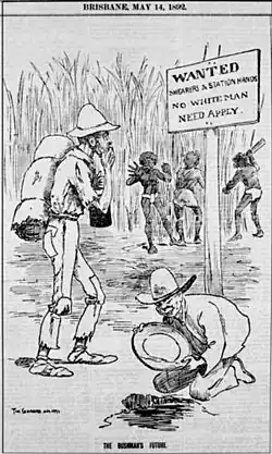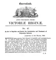 Nach Eintritt Queenslands in die neue australische Staatengemeinschaft wurde im selben Jahr der Pacific Island Labourers Act (1901) erlassen, demzufolge Arbeitskräfte von den Pazifikinseln Australien bis zum 31. Dezember 1906 verlassen mussten. Insulaner, die vor dem 1. September 1879 auf den Kontinent gekommen waren, sowie solche, die auf Schiffen beschäftigt wurden, fielen nicht unter dieses Gesetz.[68]