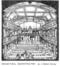 Mutmaßliche Nachbildung des zweiten Blackfriars Theatre nach zeitgenössischen Belegen von G. Topham Forrest, 1921