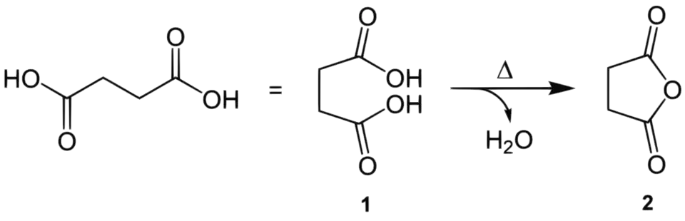 Ein Beispiel für eine Dicarbonsäure mit zwei Methylengruppen wäre die Bernsteinsäure (1). Aus 1 bildet sich unter Wasserabspaltung Bernsteinsäureanhydrid (2):