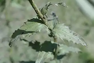 Die wechselständig angeordneten Laubblätter sind meist in Blattstiel und Blattspreite gegliedert, aber die oberen sitzend. Die Blattspreite ist leierförmig fiederschnittig bis einfach, die oberen sind halbstängelumfassend. Der Blattrand ist mit grannenartigen, weißlichen Zähnen besetzt.[2]