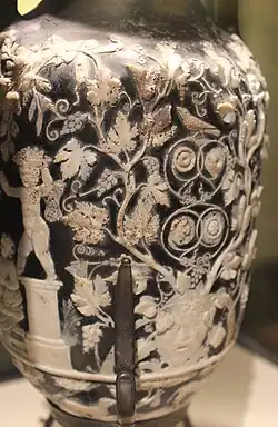 Die Bilder sind Teil eines ganzen Schmucksystems, das sehr engmaschig und reichhaltig den gesamten Körper unterhalb des Halses einnimmt. Auf einer Seite gibt es eine Silenmaske, auf der anderen Seite eine weibliche Maske. Diesen entwachsen die Weinranken, die den Gefäßkörper umschlingen. An vielen Stellen sind Weinfrüchte zu sehen, an anderen werden auch Vögel in den Ranken sitzend gezeigt.