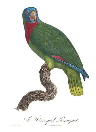 Blaukopfamazone, Zeichnung von Jacques Barraband (Die rote Kehle ist hier zu großflächig dargestellt) | ||||||||||||