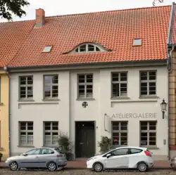 • Nr. 40: 2-gesch. historisierendes, verklinkertes, saniertes Haus der Kirchengemeinde mit Giebelrisalit und kräftigem Gesims; Sitz des Förderkreises St.-Georgen zu Wismar