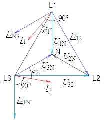 Der umfassendste Fall ist der Vierleiter-Stromkreis mit Neutralleiter und drei Außenleitern, wie er im Niederspannungsnetz mit = 230 V oder = 400 V verbreitet ist, in Verbindung mit beliebiger Belastung. Beliebig soll hier heißen: In den drei Außenleitern können Ströme mit unterschiedlichen Amplituden und unterschiedlichen Phasenverschiebungswinkeln zur jeweiligen Bezugsspannung fließen. Damit ist die Blindleistung messbar mit drei Leistungsmessern oder einem Kombinations-Gerät. Die entsprechende Schaltung zur Messung induktiver Blindleistung zeigt das Bild. Was gemessen werden soll, nämlich