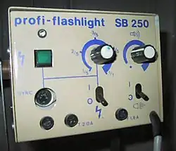 - Blitzgenerator, eine zumeist elektronische Steuereinheit, mit der Foto-Blitzanlagen angesteuert werden. Blitzgeneratoren können eigene Geräte sein, an die die Blitzlampen angeschlossen werden. Es gibt aber auch Geräte mit integrierten Blitzlampen.