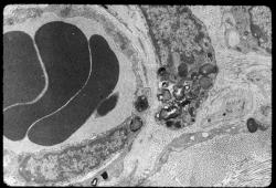 Eine spezielle Eigenschaft weisen offensichtlich nur die auf den zerebralen Kapillaren liegenden Perizyten auf. Sie fungieren dort als Makrophagen. So befinden sich im Zytoplasma der Perizyten viele Lysosomen und in vivo zeigen sie die Fähigkeit zur Aufnahme von löslichen Tracern, die intravenös oder intraventrikular verabreicht werden und sonst nur von Makrophagen aufgenommen werden. In Gewebekulturen wurde bei Perizyten die Fähigkeit zur Phagozytose[45][46] und der Antigen-Präsentation[47][48] nachgewiesen.[34]
