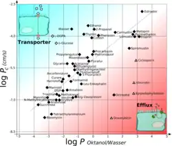 Bezüglich der Lipophilie ist der Verteilungskoeffizient in Oktanol/Wasser ein wichtiger Indikator für die Fähigkeit einer Substanz, durch die Blut-Hirn-Schranke diffundieren zu können.[110] Der Verteilungskoeffizient wird üblicherweise in logarithmischer Form als log P angegeben. Ein log P-Wert einer Substanz von beispielsweise 3,8 bedeutet dabei, dass diese Substanz sich in einer um den Faktor 103,8 höheren Konzentration in Oktanol (lipophil) als in Wasser (hydrophil) verteilt. Liegt der log P-Wert bei 0, so verteilt sich die Substanz in beiden Phasen gleich, ist er negativ, so ist die Substanz hydrophil. Lipophile Substanzen können prinzipiell am leichtesten die aus Fettsäuren aufgebaute Plasmamembran der Zellen passieren. Liegt der log P-Wert oberhalb von 3, so nimmt dieser Effekt meist wieder ab, da solche Moleküle eine hohe Bindungsaffinität zu Plasmaproteinen haben.