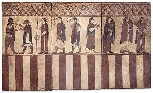 Zunächst war unklar und umstritten, welche Ereignisse durch die beiden Personengruppen dargestellt werden sollten. Man vermutete, dass die beiden Männer auf der linken Seite Priester charakterisieren, vielleicht einen Haruspex, der Blitze deutete und aus den Eingeweiden von Opfertieren weissagte, und einen Augur, der den Flug und die Laute der Vögel und anderer Tiere deutete. Die weibliche Figurengruppe wurde als Trauerzug aus dem Totenkult oder als Szene der Verehrung einer Göttin interpretiert, die der Prozession voranschreitet.